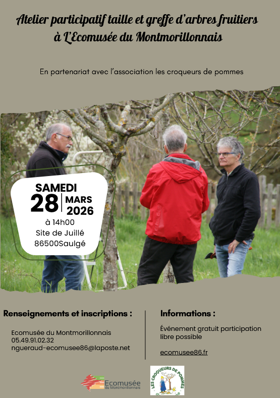 En ce début de printemps, l'Ecomusée du Montmorillonnais vous accueille sur son site de visite, à Juillé, pour profiter des judicieux conseils des "Croqueurs de Pommes" sur la taille et la greffe sur les arbres fruitiers. Le verger de l'Ecomusée permettra des démonstrations participatives. Rdv à 14h