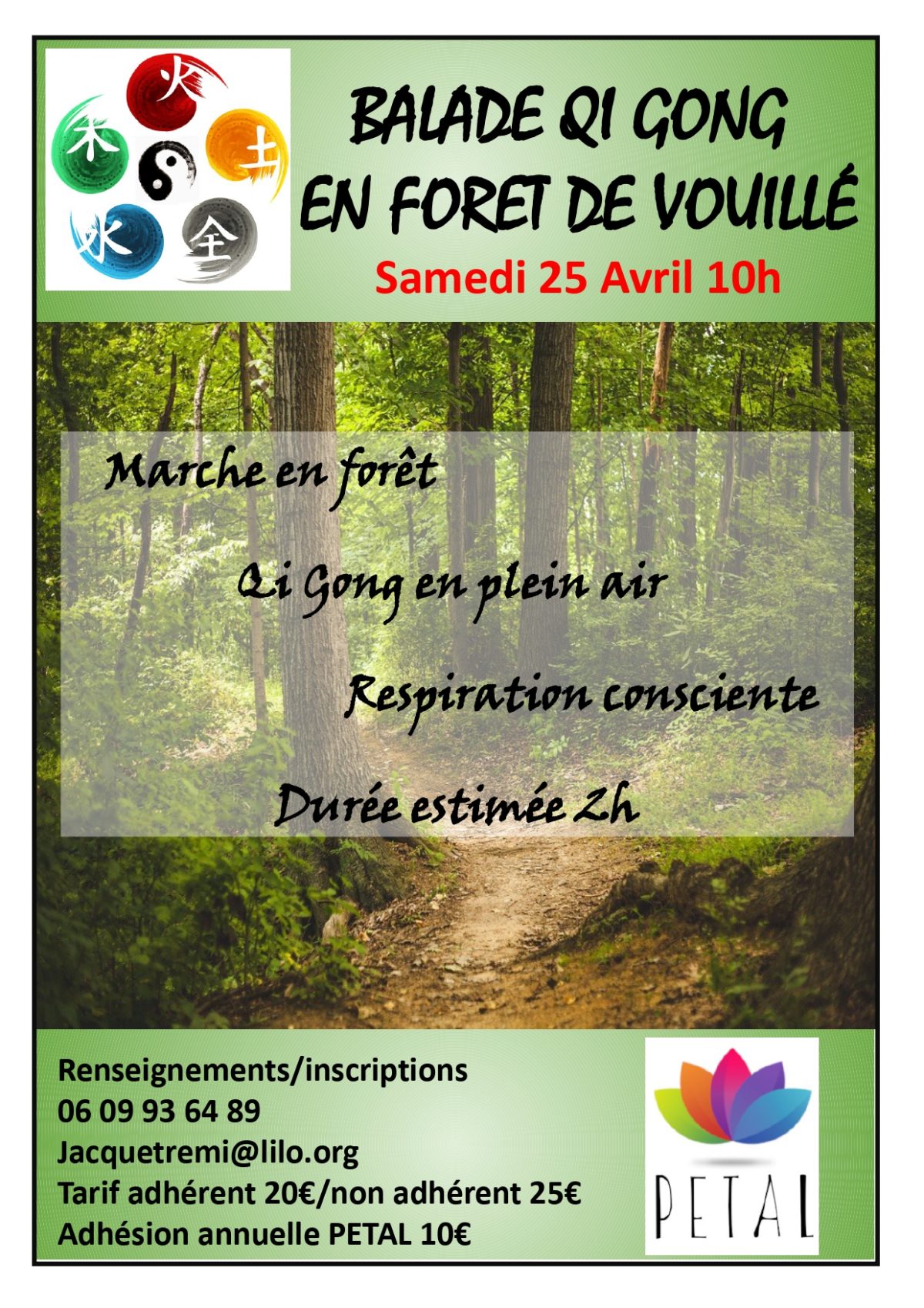 Une sortie Qi gong est programmée le samedi 25 Avril à 10h. Venez goûter le renouveau printanier en arpentant ce coin de forêt et en pratiquant accompagné par le chant des oiseaux. Comme d'habitude la balade durera environ 2h en alternant la marche et le Qi gong. 06 09 93 64 89 jacquetrem@lilo.org tarif adhérent 20€ / Non adhérent 25€ Adhésion annuelle association Petal 10€