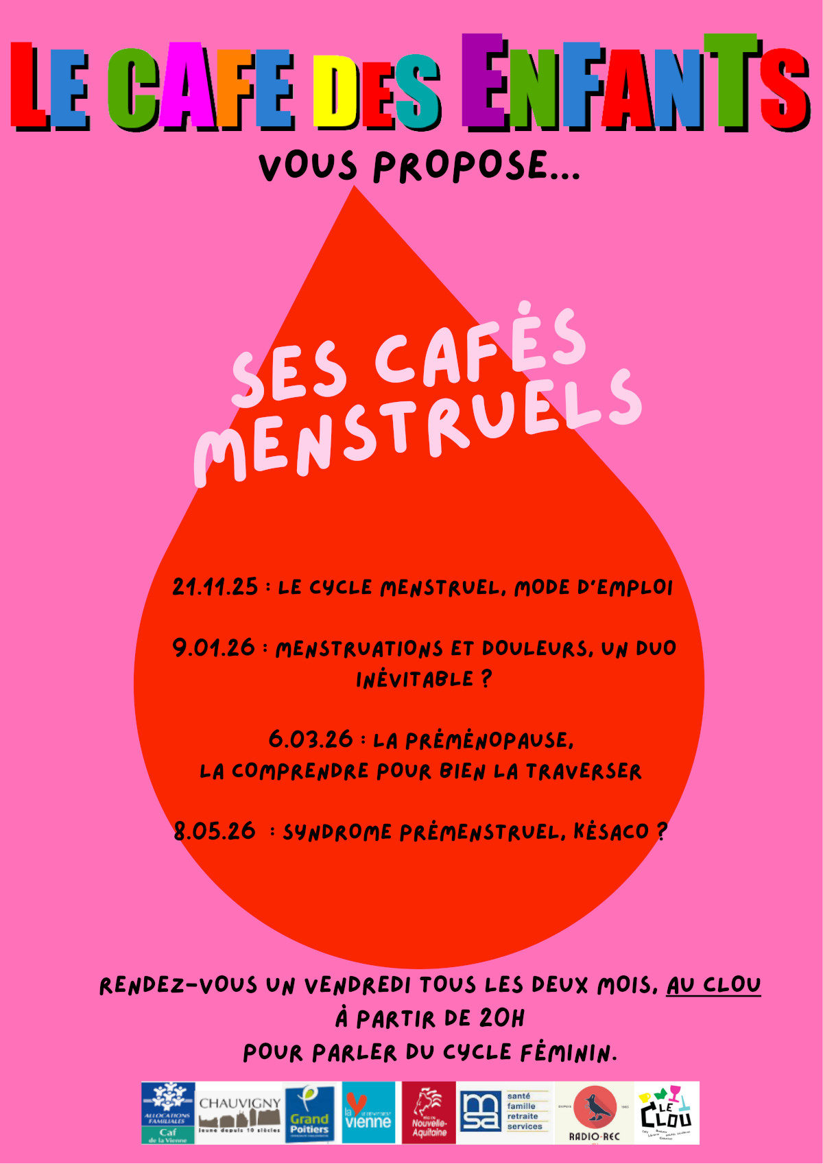 Syndrome prémenstruel, késaco ? Le but de ces cafés menstruels est de permettre de connaître ton corps et celui de toute personne avec un utérus (ou plus d’utérus). Le comprendre pour ne pas le subir, le comprendre pour l’accepter et vivre pleinement sans gêne et sans tabou.