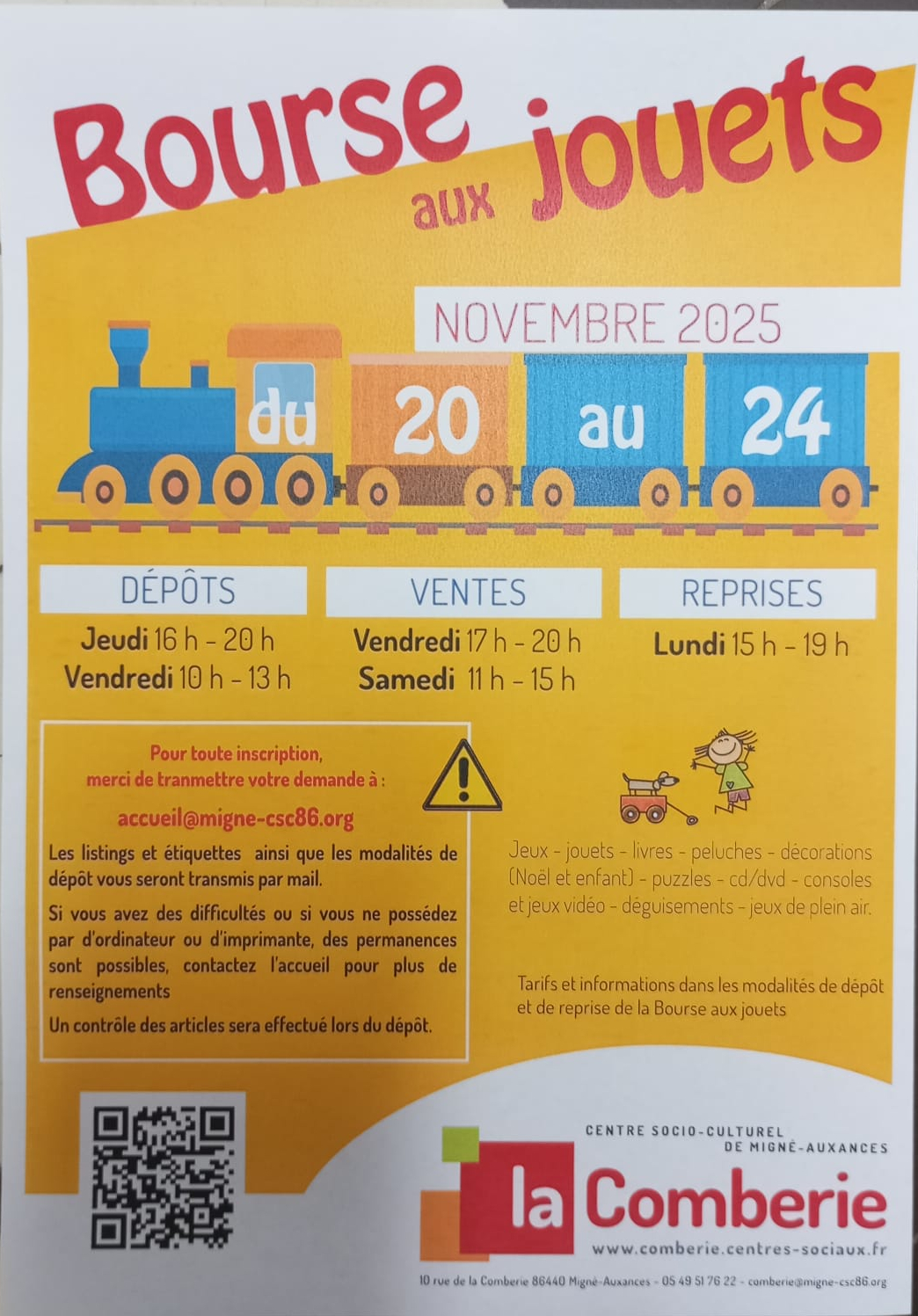 Le Centre Socio-Culturel « La Comberie » organise sa Bourse aux Jouets les 20,21,22 et 24 novembre prochain. Dépôt les jeudi 20 novembre de 16h à 20 h et vendredi 21 novembre de 10h à 13 h Vente les vendredi soir de 17 h à 20 h et samedi 22 novembre de 11h à 15 h Reprise lundi 24 de 17h à 19 h