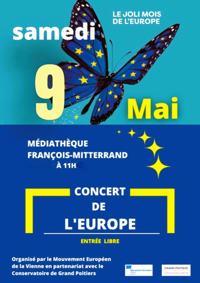 A l'initiative du Mouvement Européen de la Vienne, en partenariat avec le Conservatoire à Rayonnement Régional de Grand Poitiers et la Médiathèque François Mitterrand. Concert des élèves du Conservatoire pour cet événement annuel, à 11 h en ce samedi 9 mai : la Journée de l'Europe. Entrée libre,