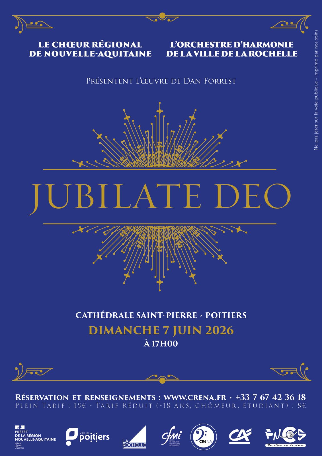 Réservation obligatoire : https://www.crena.fr/collect/description/695799-r-concert-jubilate-deo-du-07-juin-2026-a-la-cathedrale-de-poitiers