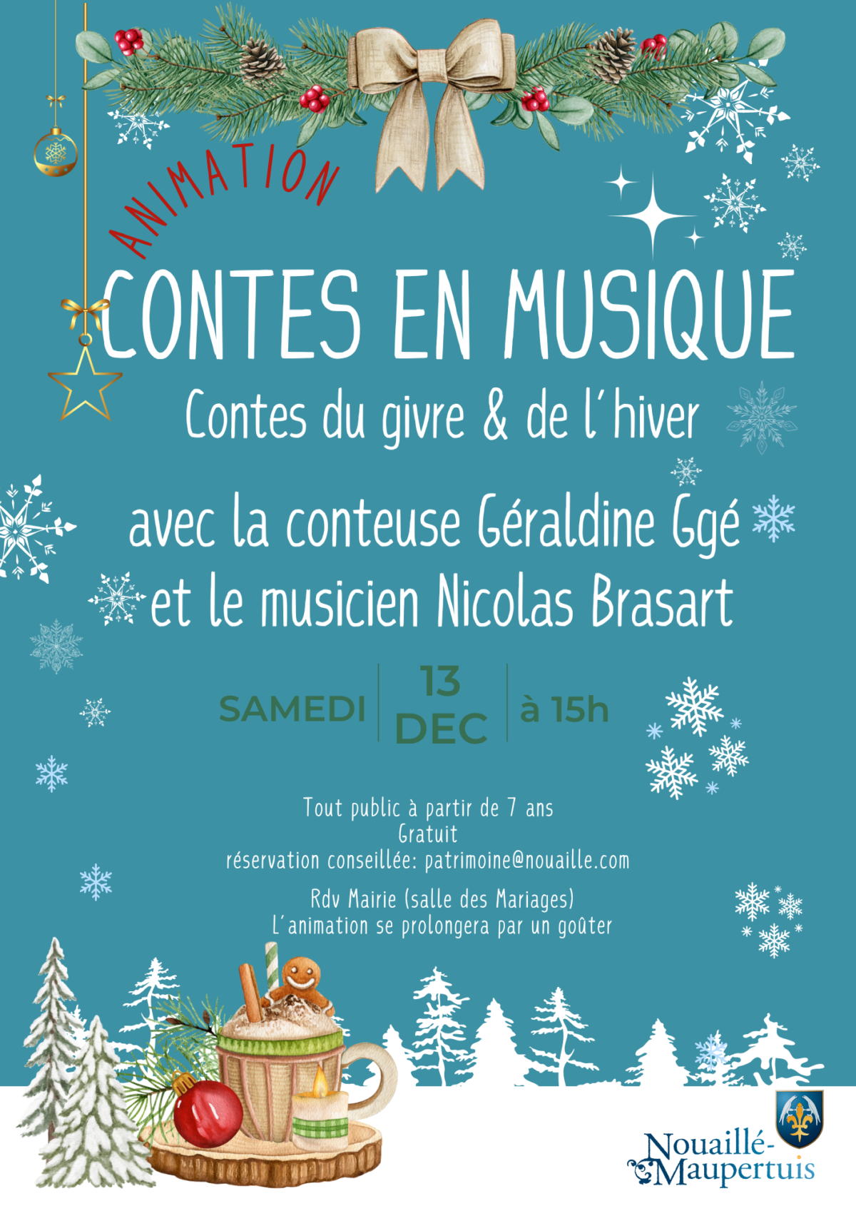 Contes du givre & de l'hiver. A l'occasion de la fin d'année, Géraldine Ggé a rassemblé quelques contes de neige et de forêts. Accompagnée par des les impros musicales de Nicolas Brasart, elle emmènera petits et grands dans des temps reculés et des lieux oubliés pour revivre ensemble la magie des contes d'hiver. Réservation conseillée. Animation suivie d'un goûter. Rdv Mairie