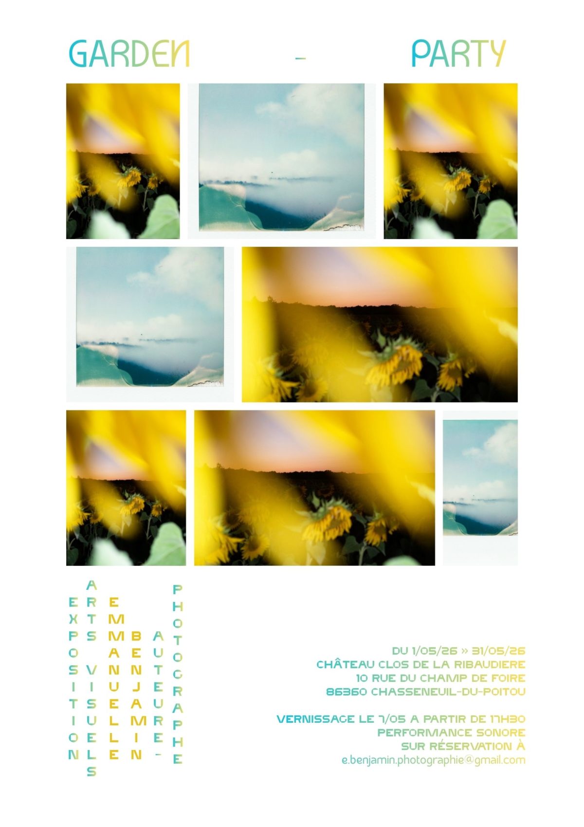 Du vendredi 01 mai 2026 au dimanche 31 mai 2026 Château du Clos de la Ribaudière - 10 rue du Champ de Foire - 86360 - Chasseneuil-du-PoitouLe jardin est un motif iconographique dans l'histoire de l'art. Pour cette exposition nommée "Garden Party", l'auteure-photographe Emmanuelle BENJAMIN, investit les lieux du Clos et propose ses "jardins" oniriques! Issus souvent d'écosystèmes fragiles. Vernissage le 7/05 à 18h sur réservation.