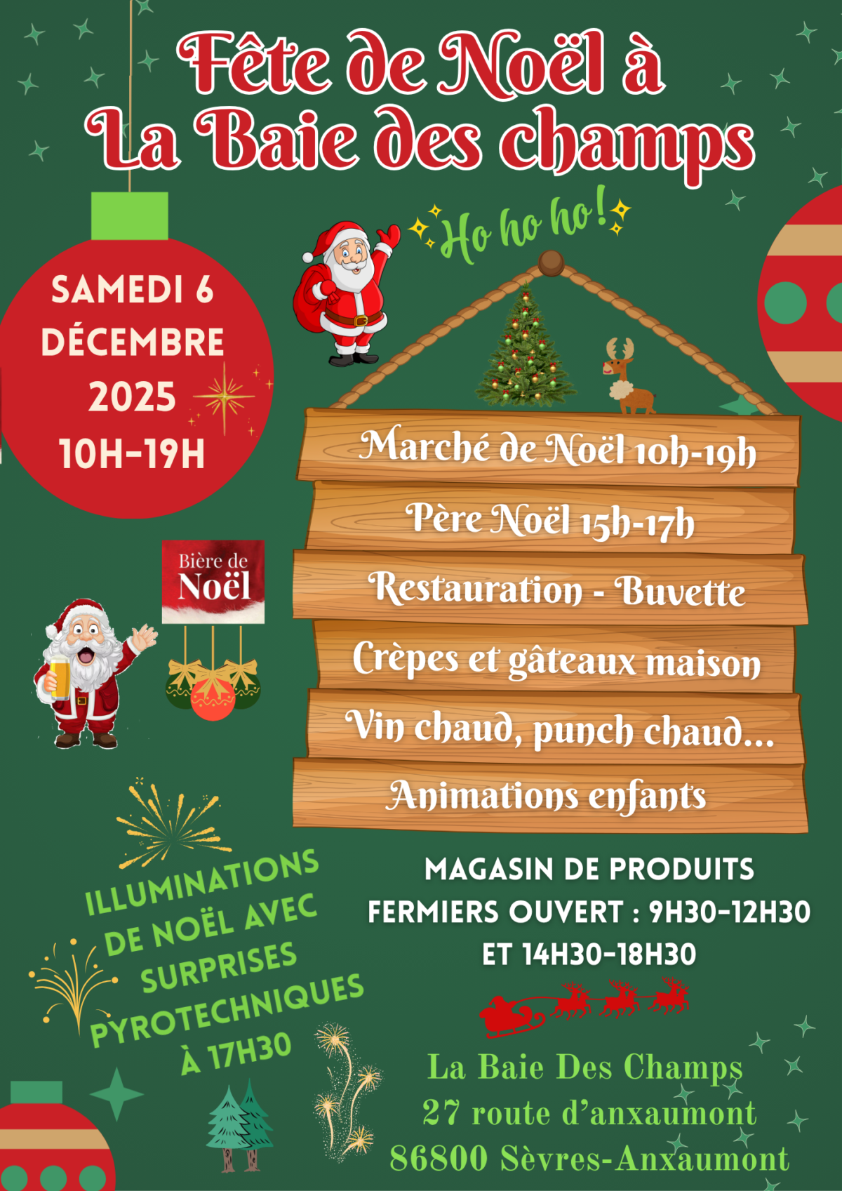 La magie de Noël à La Baie des Champs. Marché de Noël de 10h à 19h, plus de 25 exposants. Magasin de produits fermiers ouvert toute la journée. Photos avec Père Noël 15h à 17h. Animations et surprises enfants. Illuminations de Noël à 17h30. Buvette : vin chaud, bière de Noël. Restauration sur place.