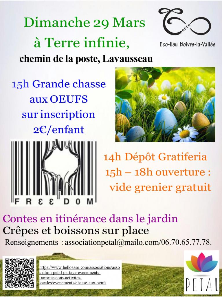 Une Grande CHASSE AUX OEUFS, GRATIFERIA et DES CONTES EN ITINERANCES seront organisés par l'Association Petal dans le jardin de Terre Infinie, le dimanche 29 mars à 15h. sur inscription Hello asso. https://www.helloasso.com/.../evenements/chasse-aux-oeufs Boissons et crêpes en vente sur place Tarifs : 2€/enfants qui participent à la chasse aux oeufs Par la même occasion, des CONTES EN ITINERANCES et une GRATIFERIA se dérouleront de 15h à 18h (dépôt des objets pour la gratiferia à 14h). Gratiferia et contes GRATUIT Renseignements : 06.70.65.77.78 ou associationpetal@mailo.com