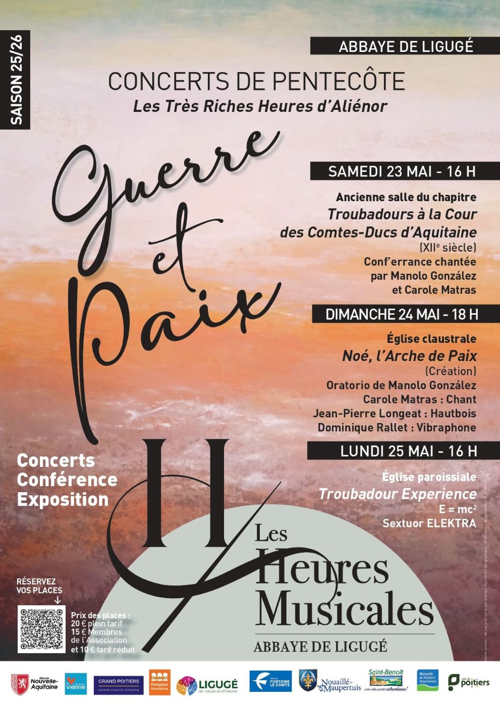 Trois jours de musique: Les Très Riches Heures d'Aliénor - Guerre et Paix - Samedi 23 mai - 16 h (Ancienne salle du chapitre). "Troubadours à la Cour d'Aquitaine : Une conf’errance chantée" par Manolo González et Carole Matras. - Dimanche 24 mai - 18 h (Église claustrale). "Noé, l’Arche de Paix : création d'un oratorio de Manolo González, avec Carole Matras (chant), Jean-Pierre Longeat (hautbois), Dominique Rallet (vibraphone) et l'ensemble Absalon. - Lundi 25 mai - 16 h (Église paroissiale). "Troubadour Expérience (E=mc2)" par le sextuor ELEKTRA. Tarifs par séance: 20€/15€/10€. Site internet: https://lesheuresmusicales4.wixsite.com/abbaye-de-liguge