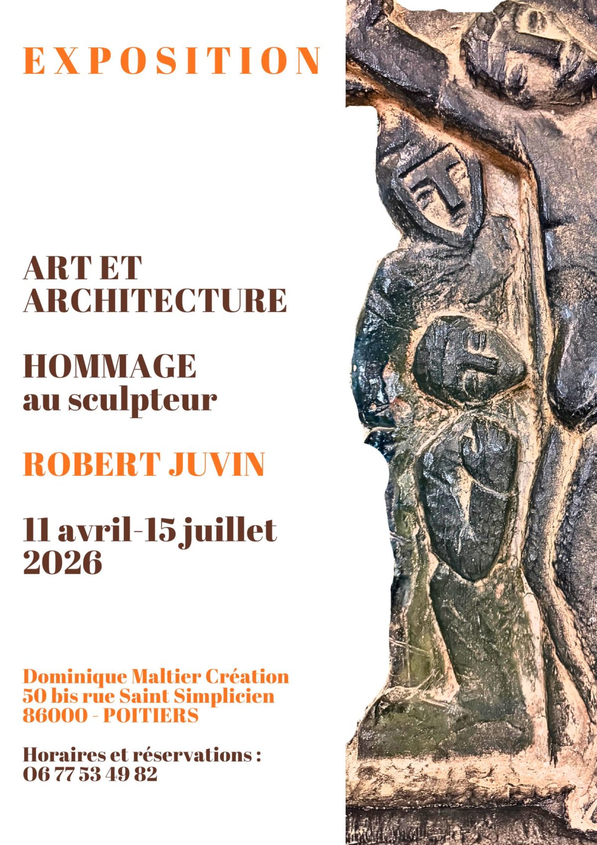 Du samedi 11 avril 2026 au dimanche 07 juin 2026 POITIERS - 50 bis rue Saint Simplicien - 86000 - POITIERSHommage au sculpteur Robert Juvin (192162005). Fondateur et animateur du groupe "Mur Vivant". Il souhaite "faire fusionner tous les arts et les mettre au service de l'architectures". On pourra admirer lors de cette exposition des reliefs en verre, des dessins, une importante sculpture en bois...