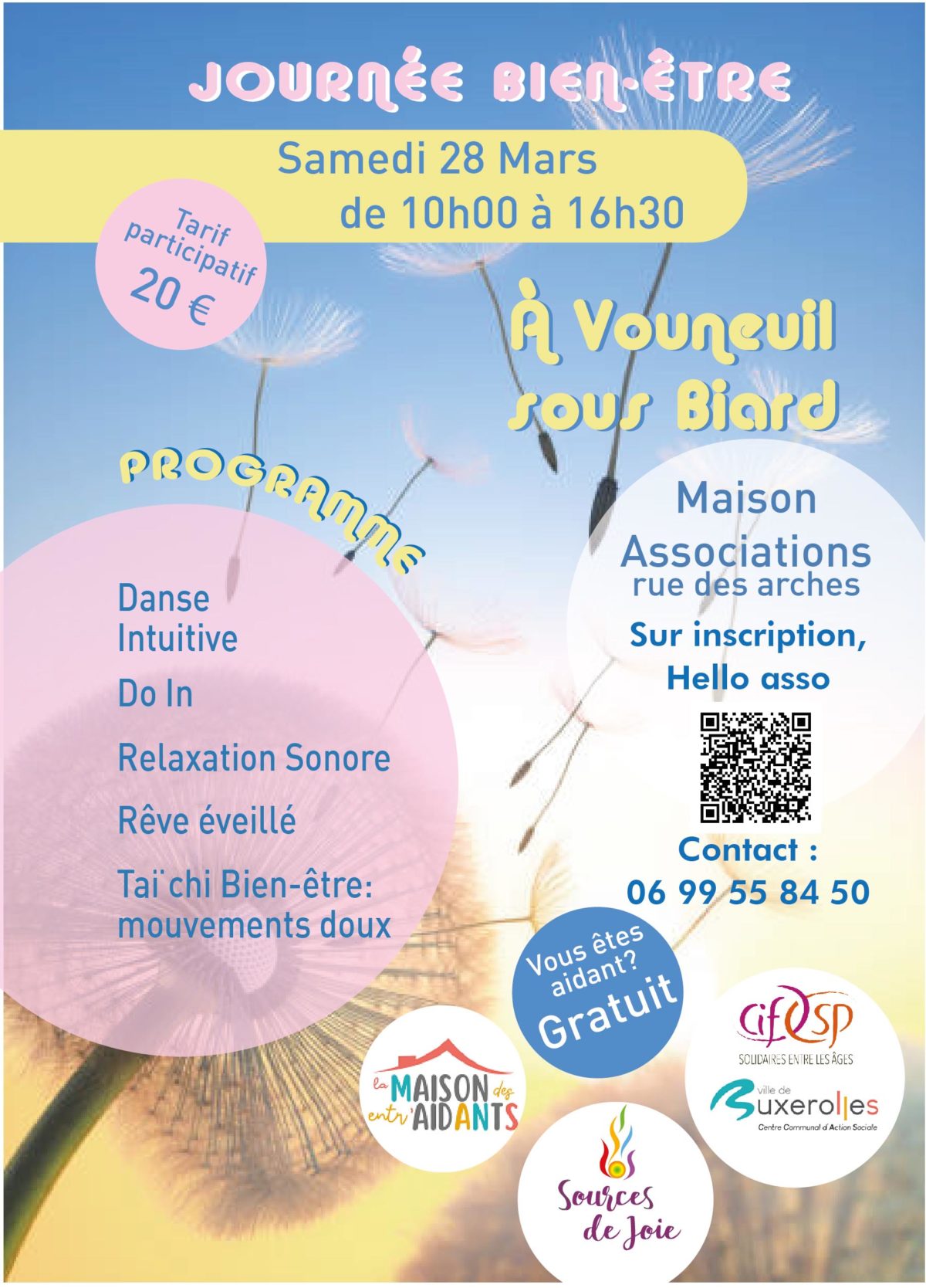 Rens : Renseignements au 06 99 55 84 50 ou à sourcesdejoie@gmail.com Tarif 20 €, gratuit pour les aidants