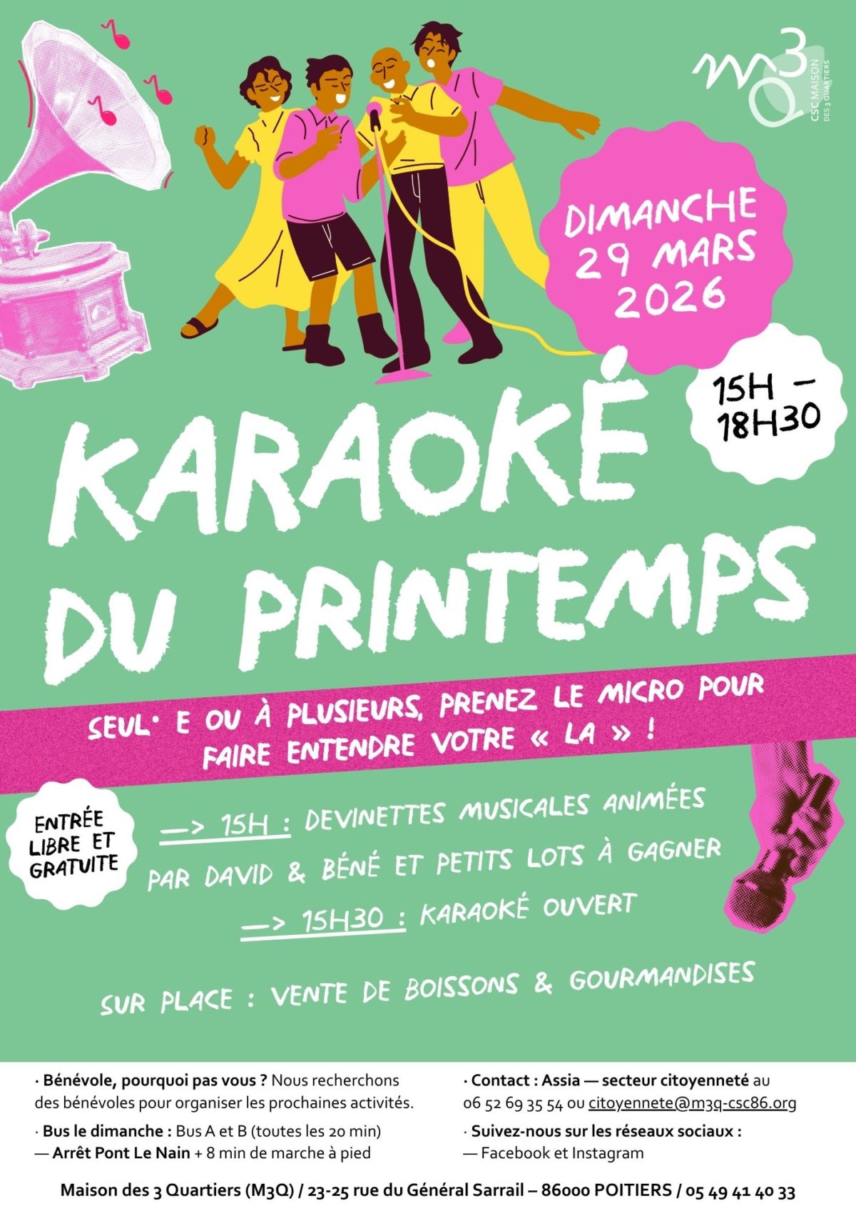 Karaoké du printemps à la M3Q ! Seul·e ou à plusieurs, prenez le micro pour faire entendre votre "la" ! · 15h : devinettes musicales animées par David & Béné et petits lots à gagner · 15h30 : Karaoké ouvert Sur place : vente de boissons et gourmandises Entrée libre et gratuite !