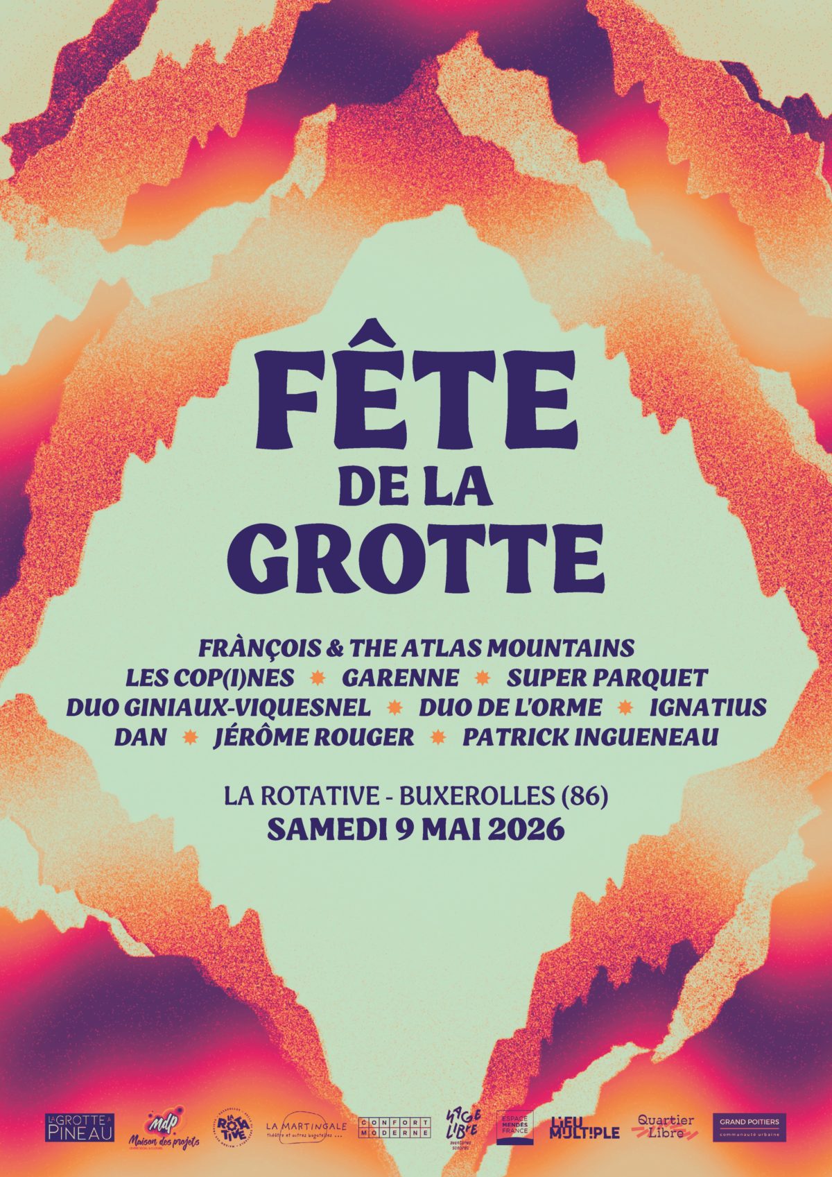 La Fête de La Grotte à Pineau est le premier événement public organisé par l’équipe de la chaîne YouTube éponyme. Depuis 5 ans, La Grotte à Pineau s’est imposée comme un média musical indépendant, singulier et fédérateur, diffusant des concerts filmés en plan séquence dans un univers troglodyte unique. Éclectique et sans étiquette, elle tisse une ligne musico-éditoriale originale, ouverte à toutes les esthétiques – du répertoire savant aux musiques populaires, des traditions revisitées aux explorations expérimentales. Cette journée à La Rotative est pensée comme une fête vivante et collective, une traversée musicale du matin jusqu’au bout de la nuit : de l’intime à la transe caractérisée, du concert de chambre à la liesse ! L’idée est de sortir des murs de notre troglo favori pour en faire circuler l’esprit convivial et rassembleur. Une grande fête où l’on vient pour se retrouver, se découvrir, partager de la musique, et célébrer ensemble La Grotte — qu’elle fasse déjà partie de nos vies ou qu’on y entre pour la première fois. 11H - Igniatius - Église du Bourg de Buxerolles 14H30 - Dan / Duo De L'Orme / Duo Giniaux-Viquesnel - Parcours itinérant, départ à la maison des projets 18H30 - Les Cop(i)nes - La Rotative 20H - Garenne - La Rotative 21H30 - François And The Atlas Moutain - La Rotative 23H - Super Parquet - La Rotative