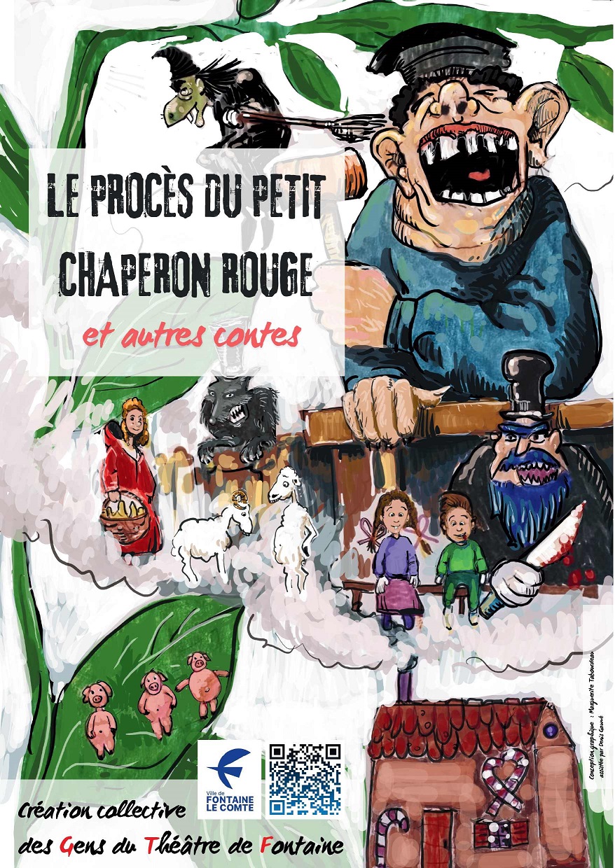 LE PROCÈS DU PETIT CHAPERON ROUGE et autres contes Barbe-Bleue a-t-il vraiment commis les crimes dont on l’accuse ? Les Trois Petits Cochons sont-ils un conte écolo ? Voici quelques questions auxquelles un Tribunal Populaire tentera de répondre. On accuse le Loup d'avoir mangé le Chaperon Rouge. Mais pouvait-il être en même temps près de la rivière avec l’agneau ou dans la montagne avec la chèvre de M. Seguin ? Barbe-Bleue a-t-il vraiment commis les crimes dont on l’accuse ? Les Trois Petits Cochons sont-ils un conte écolo ? Voici quelques questions auxquelles un Tribunal Populaire tentera de répondre. Avec Les joueurs, improvisateurs, trouveurs d’idées, metteurs en mots, metteurs en espace et en voix, avocats, juges, loups, cochons, Chaperons, etc. Christelle AMAND, Sandrine BAUCHÉ, Bernard BRODBERGER, Camille CHAUMET-BRUNET, Axel DUPUIS, Jean-François FAIVRE, Nathanaël GUERIN, Eléa LEDOUX, Daniel MILLET, Orian MILLET-ROMELÉ, Eloane ROBIN, Gilles TABOURDEAU, Isabelle TETTONI, Aurore THIAULT, Léo-Paul THIAULT. Durée du spectacle : 1h40