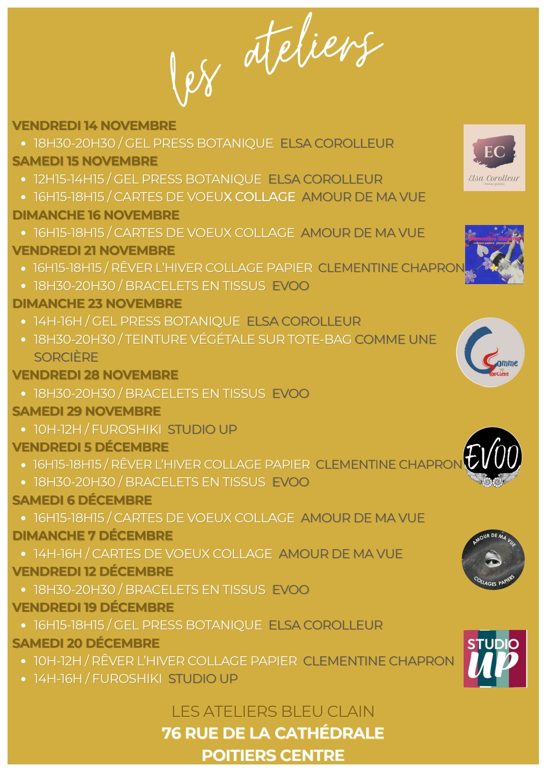 Le collectif de créatrices Bleu Clain propose 8 ateliers 6 intervenantes transmettent leurs techniques et leur créativité Fabriquez vos cartes de vœux, vos bracelets, teignez vos tote bags, emballez vos paquets de noël, tout cela avec des matériaux de réemploi et des matières végétales !