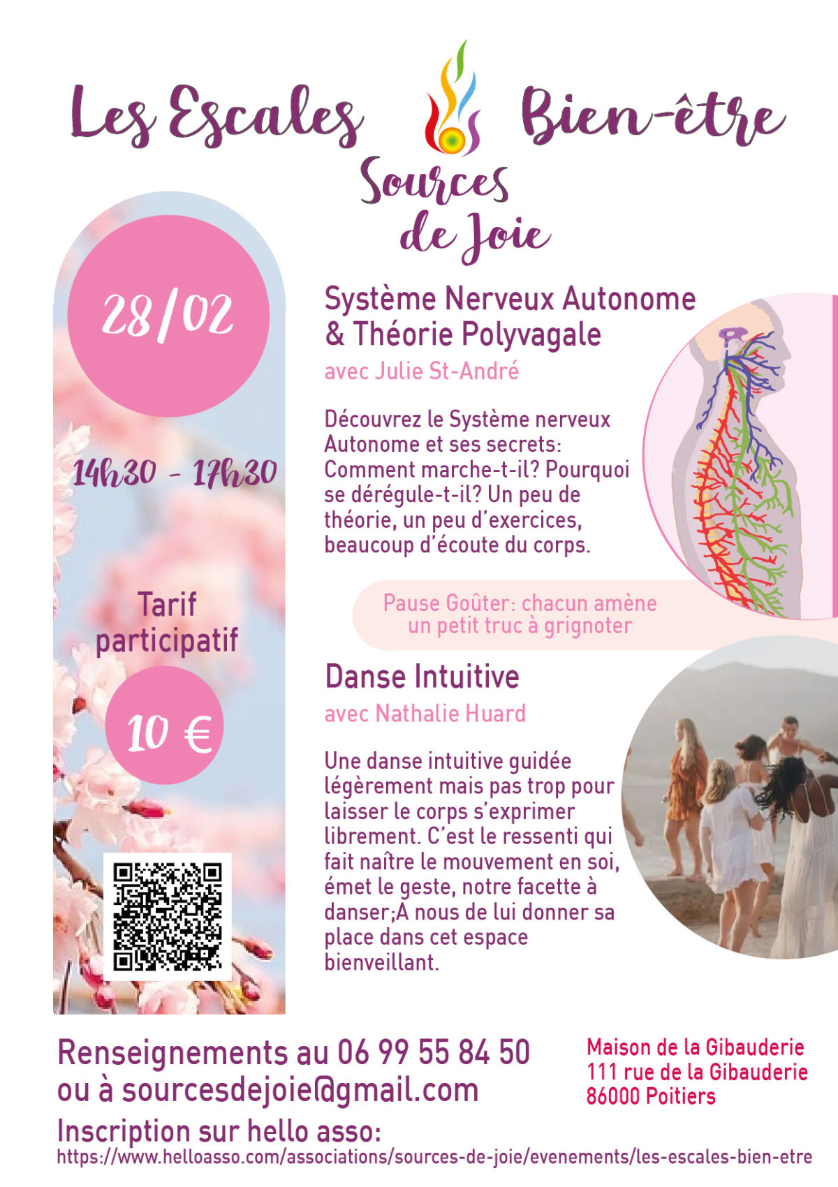 Système Nerveux Autonome & Théorie Polyvagale:Découvrez le Système nerveux Autonome et ses secrets: Comment marche-t-il? Pourquoi se dérégule-t-il? Un peu de théorie, un peu d’exercices, beaucoup d’écoute du corps. Danse Intuitive,Une danse intuitive guidée légèrement mais pas trop pour laisser le corps s’exprimer librement. C’est le ressenti qui fait naître le mouvement en soi, émet le geste, notre facette à danser;A nous de lui donner sa place dans cet espace bienveillant. Inscription sur hello asso: https://www.helloasso.com/associations/sources-de-joie