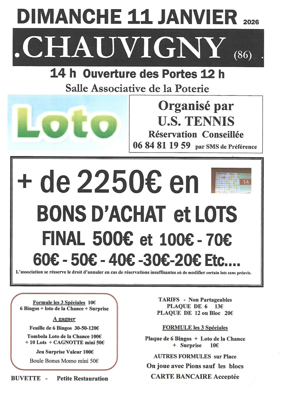 + de 2250€ en BONS D’ACHAT et LOTS B.A FINAL 500€ et 100€ -70€ - 60€ -50€ -40€ - 30€ Etc.… TARIFS Non Partageables PLAQUE DE 6 13€ - Plaque de 12 20€ FORMULE et AUTRES FORFAITS sur Place. Possibilité de jouer au marqueur (bloc)FORMULE Partie Spéciale : 6 Bingos + Loto de la Chance + Surprise 10€