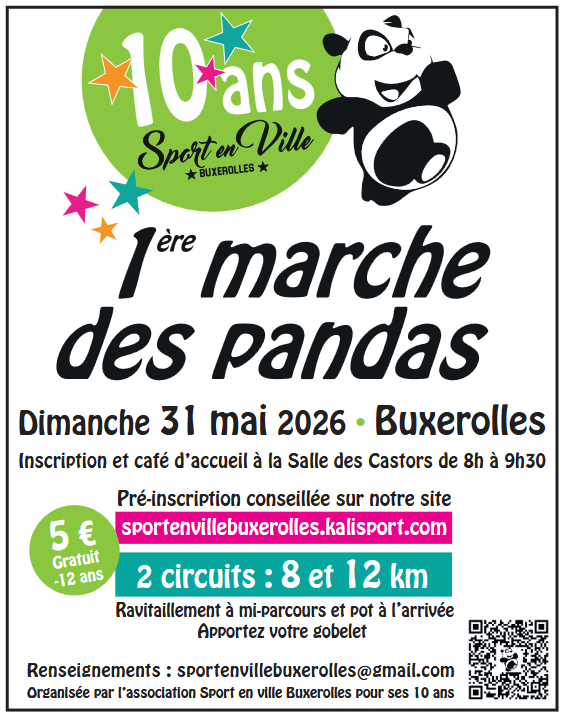 L'association Sport en ville Buxerolles fête ses 10 ans d'existence et vous propose, le dimanche 31 mai 2026, une marche avec 2 parcours (8 et 12 km) pour découvrir le patrimoine de Buxerolles. Inscription en ligne conseillée (5€) sur notre site sportenvillebuxerolles.kalisport.com