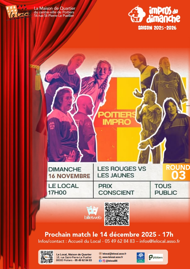 Réservation à l'accueil du Local ou en ligne : https://www.billetweb.fr/poitiers-impro-match-3-saison-2025-2026 Pour venir, pensez au bus : lignes O, 12 et 15, arrêt Baptistère Saint-Jean. Si vous devez venir en voiture, pensez au parking Hôtel de Ville (forfait de 1€ valable de 14h à 19h le dimanche).