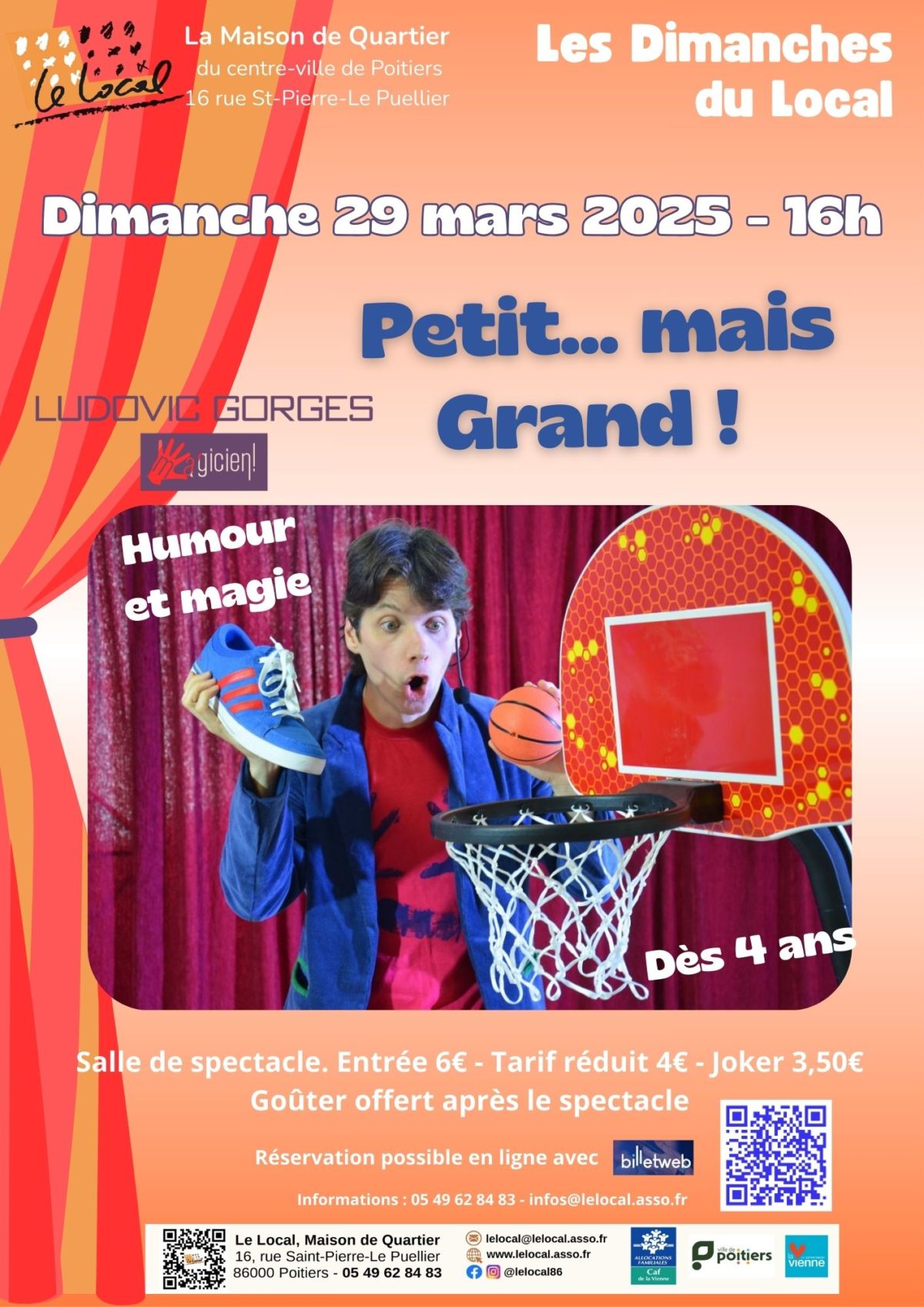 Spectacle tout public dès 4 ans. Réservation à l'accueil du Local ou en ligne : https://www.billetweb.fr/petit-mais-grand-par-ludovic-gorges Pour venir, pensez au bus : lignes O, 12 et 15, arrêt Baptistère Saint-Jean. Si vous devez venir en voiture, pensez au parking Hôtel de Ville (forfait de 1€ valable de 14h à 19h le dimanche).