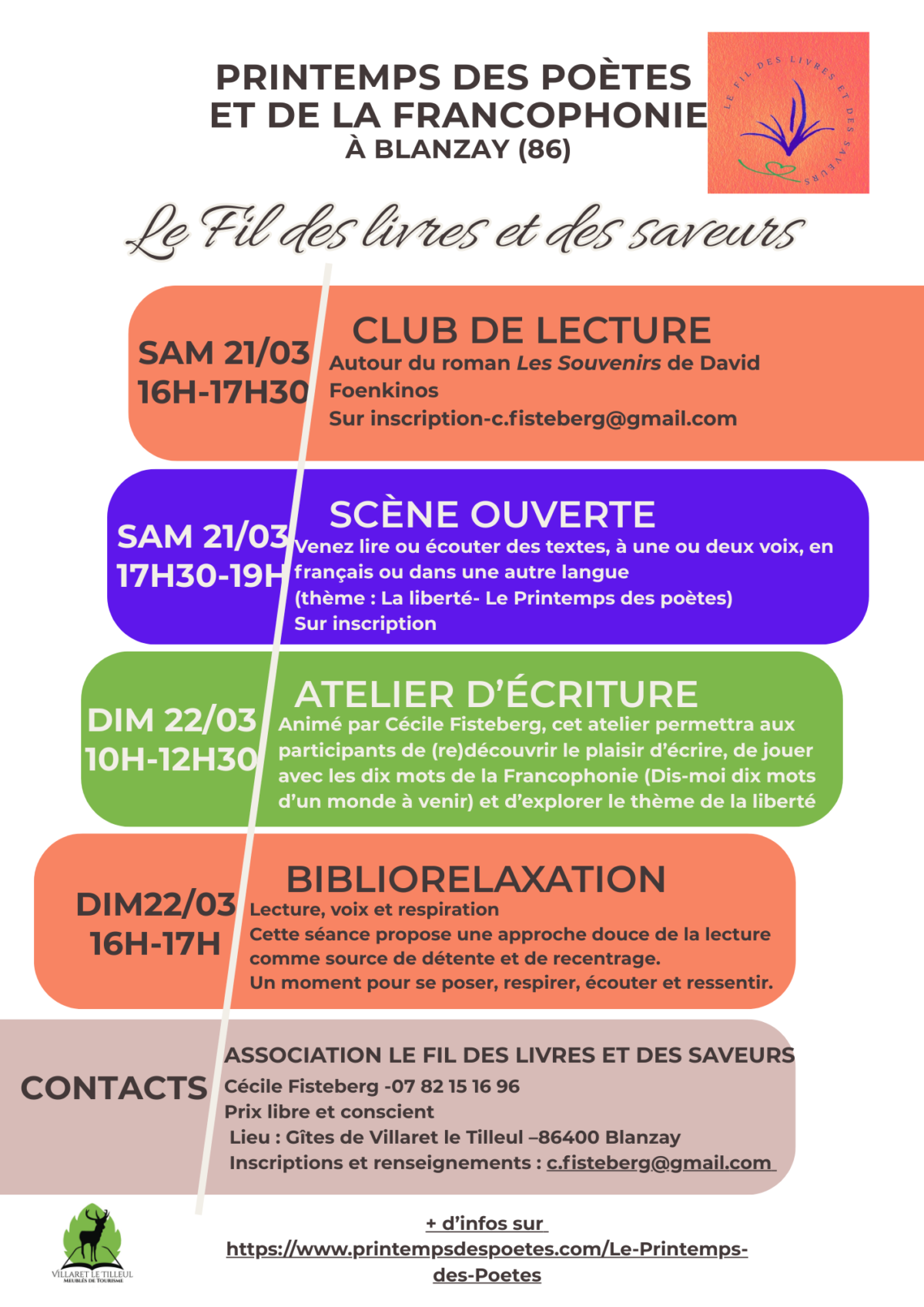 Samedi 21 mars 2026 - 17:30Gîtes de Villaret le Tilleul - 3-5 lieu-dit Villaret - 86400 - BLANZAY