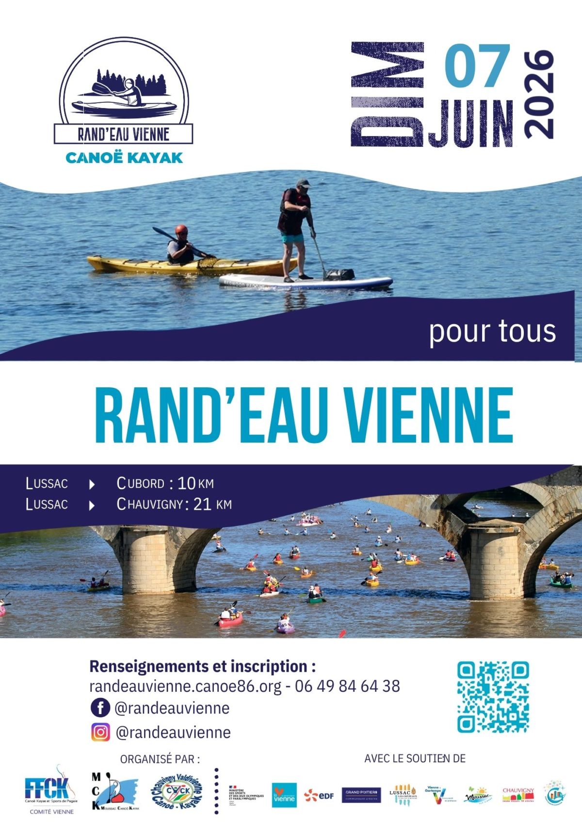 La Rand’EAU Vienne est une journée festive de canoë-kayak organisée par le CDCK 86 et les clubs de Moussac et Chauvigny. Elle se déroule au cœur de la vallée de la Vienne et propose une immersion unique entre nature, patrimoine et biodiversité. Deux parcours sont proposés : 10 km (jusqu’à Cubord) ou 21 km (jusqu’à Chauvigny). Les participants peuvent choisir entre une randonnée à allure libre, accessible à tous, ou un défi sportif chronométré. Le départ s’effectue depuis Lussac-les-Châteaux, avec un accueil dès 8h30 et des départs entre 10h15 et 11h. Un ravitaillement est prévu à mi-parcours. L’événement se clôture par des animations et une remise des récompenses à Chauvigny. Ouverte à tous, cette manifestation conviviale est idéale pour une sortie entre amis, en famille ou entre collègues. Prévoir une tenue adaptée à l’eau et savoir nager. Inscriptions en ligne jusqu’au mercredi 3 juin 2026 à 23h59. Pour les inscriptions: https://randeauvienne.canoe86.org/inscriptions/ N'hésiter pas à en parler à toutes les personnes que vous connaissez vous ne le regretterez pas! Dépêchez vous EDF offre les 50 premières inscriptions!