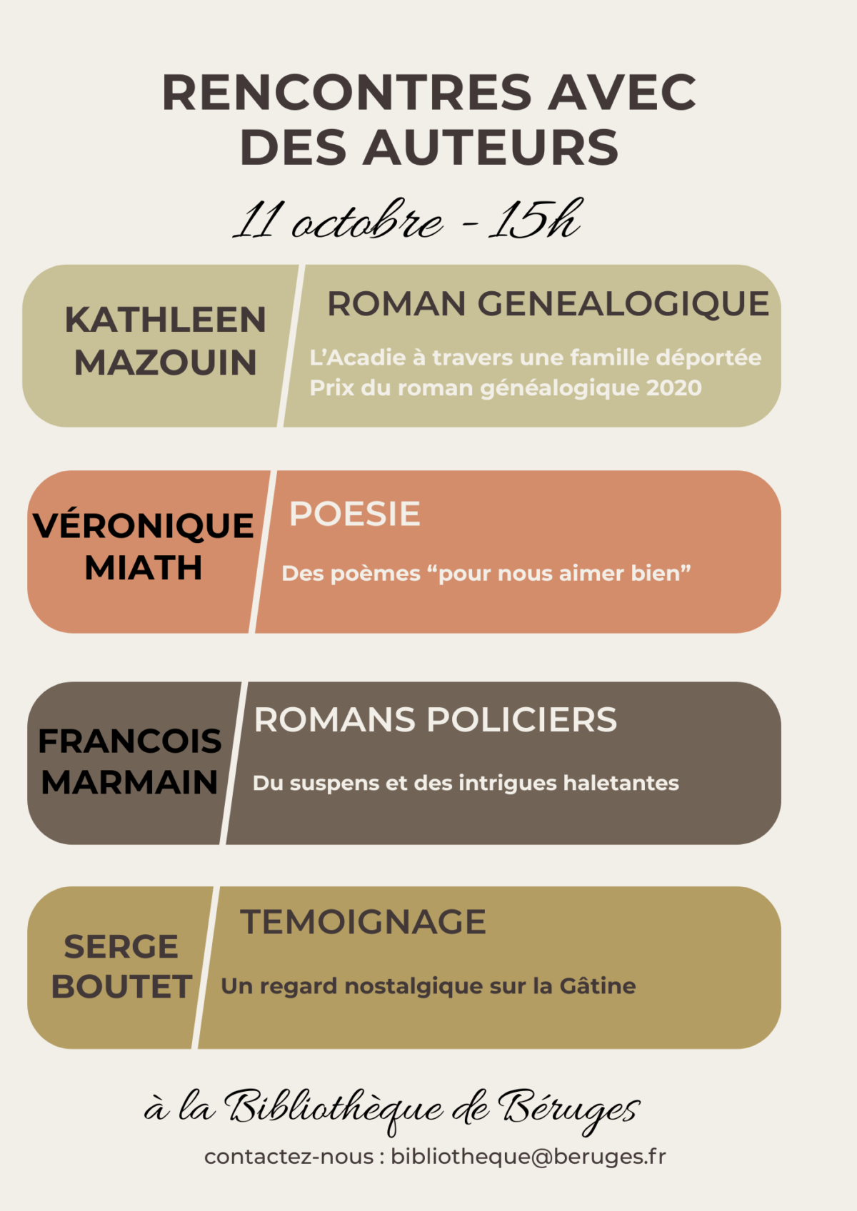 Samedi 11 octobre 2025 - 15:00Bibliothèque Marie-France Brunet - 2, rue des Villiers - 86190 - Béruges