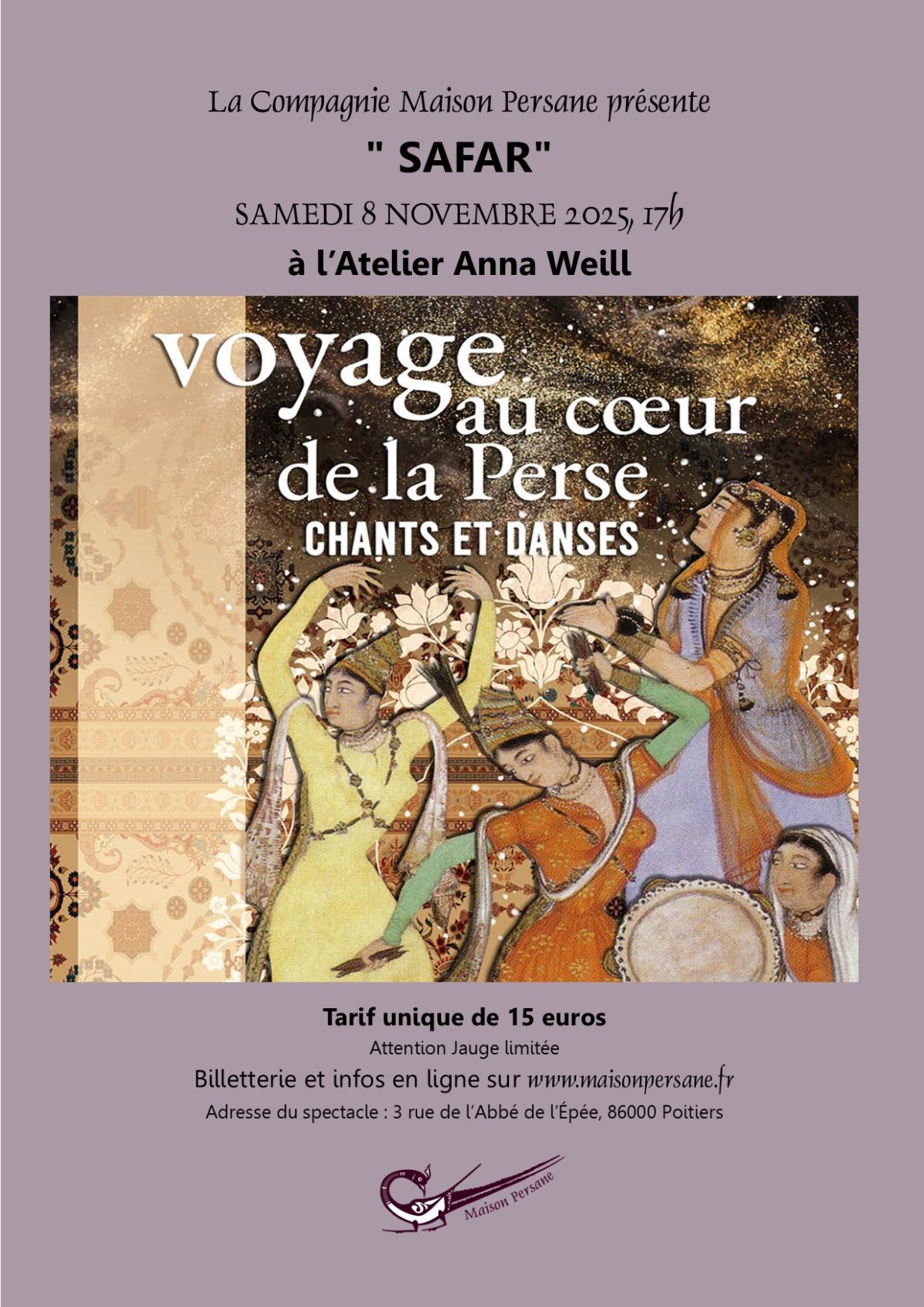 Safar - voyage en persan- est une proposition faite pour plonger au cœur de la langue et de la musique persane (savante et /ou contemporaine) dans lequel divers tableaux chorégraphiés de danse soufie, moyen-orientale, vous serez inviter à l'écoute, au recueillement, à la danse aussi. Durée : 1h30