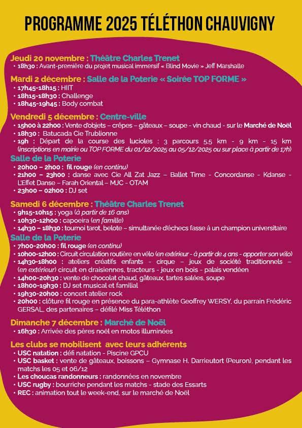 Mardi 2 décembre : salle de la Poterie séances de sport avec Top Forme - 17h45-18h15 : Hiit - 18h15-18h30 : challenge - 18h45-19h45 : body combat 5/12/25 En centre ville 15h-22h vente d'objets et de gourmandises sur le marché de Noël 18h30 Batucada La trublionne 19h : départ de la course des Lucioles, 3 parcours 5.5kms, 9kms et 15 kms (inscription à la mairie et Top forme à partir de 1/12/25 ou sur place à partir de 17h) Salle de la Poterie 20h-2h : fil rouge (3637 kms à parcourir en relais) 21h-23h : danses avec All Zat Jazz, MJC, L'effet danse, Kadanse!, Concordanse, Ballet Time, OTAM, Farah Oriental 23h-02h : DJ Set Samedi 6/12 Théâtre Charles Trenet 9h15-10h15 : yoga 16 ans et + 10h30-12h : capoeira en famille 14h30-18h30 : tournoi belote et tarot salle de la Poterie 7h-20h : fil rouge 10h-12h : circuit circulation routière en vélo à partir de 4 ans (venir avec son vélo) 14h30-18h : atelier créatif enfants, cirque, jeux de société, circuit en draisienne, tracteurs, jeux en bois, palet vendéen 14h-20h30 : vente de chocolat chaud, gâteaux, tartes salées et soupe 18h-19h30 : DJ set musical et familial 19h30-20h : concert atelier rock 20h clôture fil rouge en présence du para-athlète Geoffrey Wersyn du parrain Frédéric Gersal, des partenaires, défilé de Miss Téléthon dimanche 7/12 à 16h30 arrivée des pères Noël à motos illuminées
