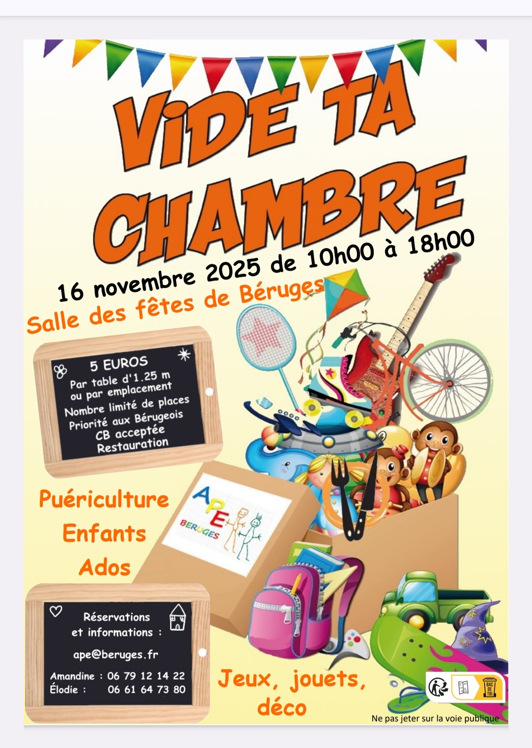 🎁 Vide ta chambre – Spécial jouets avant Noël ! 🎁 📅 Dimanche 16 novembre 🕘 De 10h à 18h 📍 Salle des fêtes de Béruges C’est le moment parfait pour préparer les fêtes sans se ruiner ! 🎅 Venez chiner parmi des jouets, livres, vêtements enfants, jeux, matériel de puériculture et bien plus encore 🧸👕📚 ✨ L’occasion idéale de faire plaisir aux enfants tout en donnant une seconde vie aux objets ! 🥪 Restauration sur place : buvette, galettes, crêpes et douceurs 🍰☕ 👉 Entrée libre 👨👩👧👦 Venez passer un moment convivial en famille !