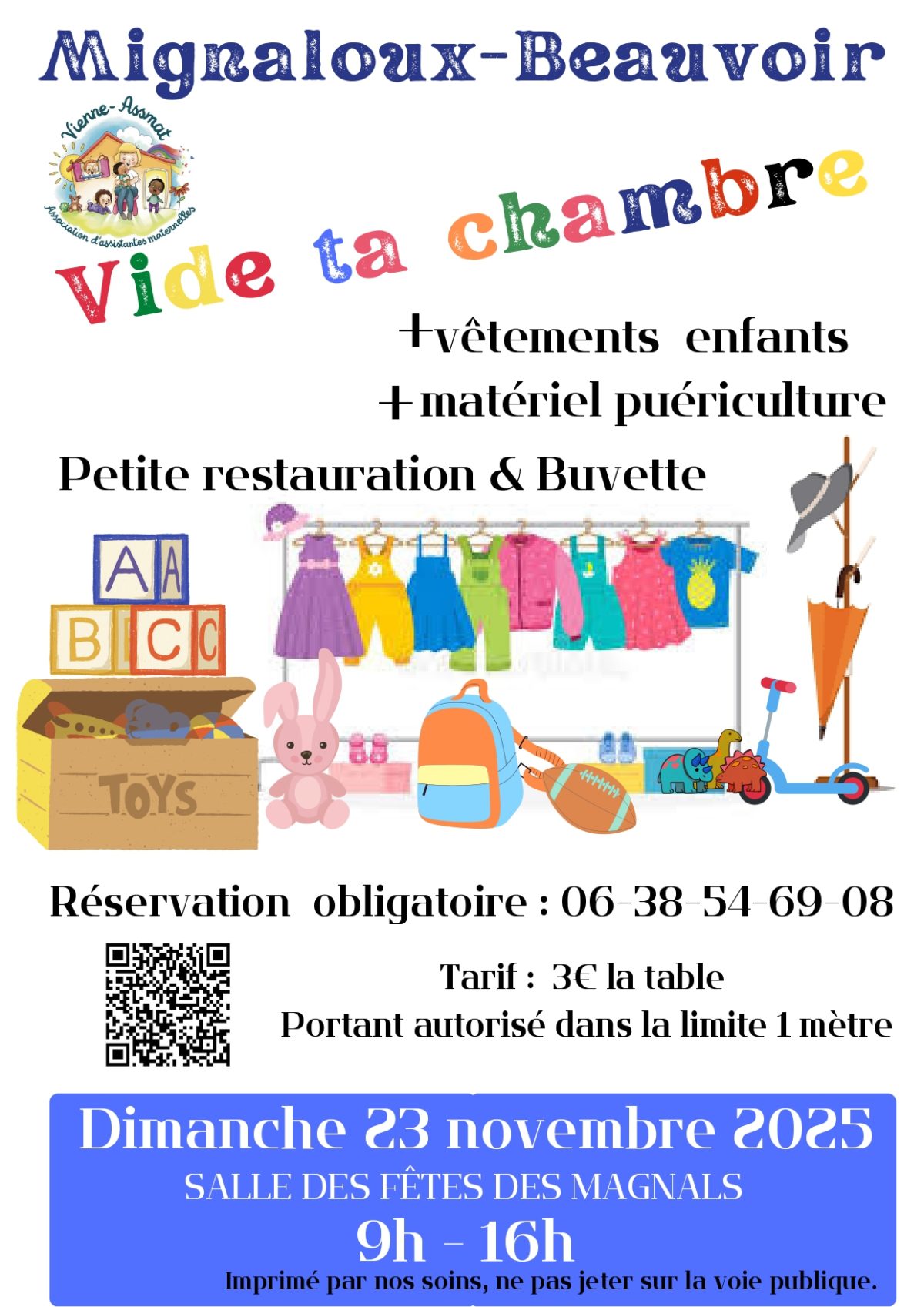 Du dimanche 23 novembre 2025 au dimanche 23 novembre 2025 Salle des fêtes des Magnals - 192 allée des Magnals - 86550 - Mignaloux-BeauvoirL'association d'assistantes maternelles Vienne-Assmat organise son premier Vide-ta-chambre +vêtements enfants et matériel de puériculture à la salle des fêtes des Magnals à Mignaloux-Beauvoir le dimanche 23 novembre de 9 h à 16 h. Petite restauration et buvette.