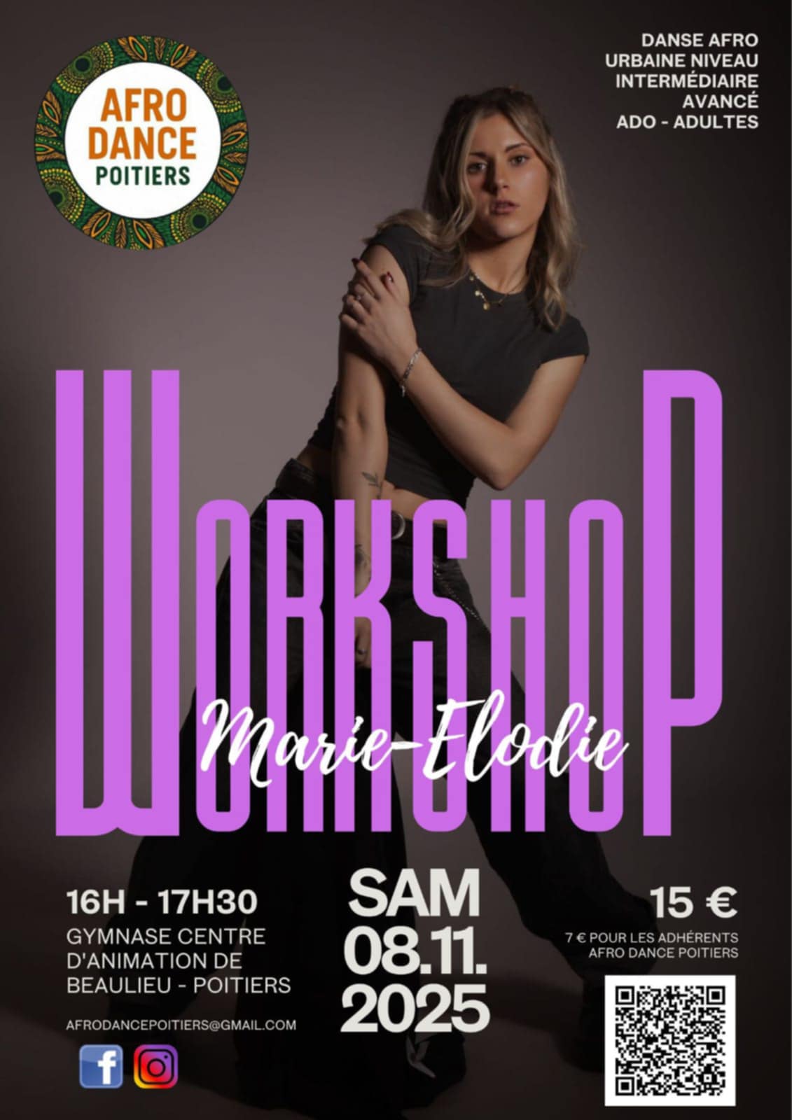 L'Association Afro Dance Poitiers vous propose un workshop de dance afro urbaine, le samedi 8 novembre 2025, de 16h00 à 17h30, avec Marie-Elodie, danseuse formée sur Paris, désormais professeur de danse. Niveau intermédiaire / avancé ; ado / adultes Tarifs : 15 € par participant ; 7 € pour les adhérents d Afro Dance Poitiers Inscriptions en ligne sur le Hello Asso d Afro Dance Poitiers Participez nombreux ! https://www.helloasso.com/associations/afro-dance-poitiers/evenements/workshop-avec-marie-elodie