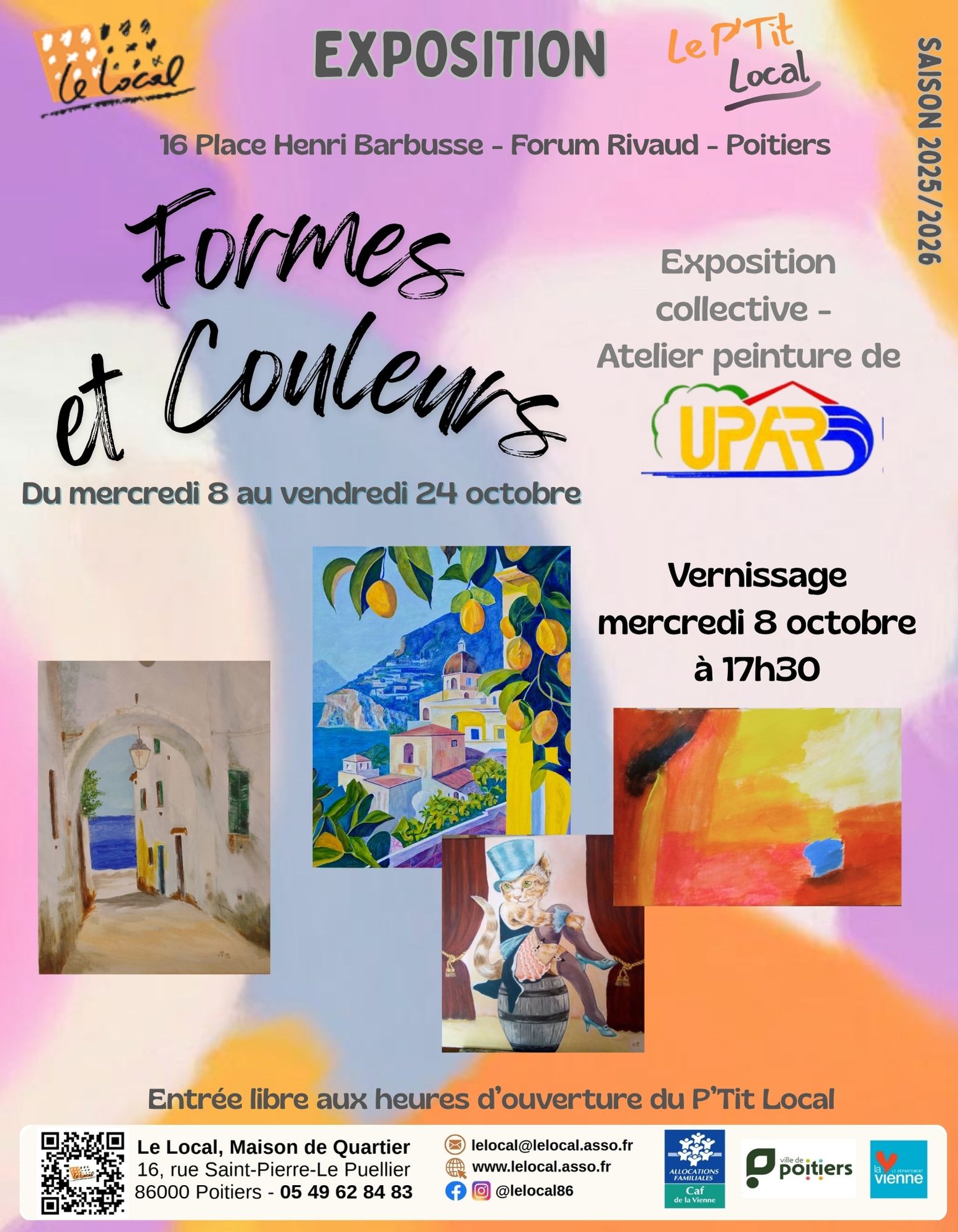 Du mercredi 08 octobre 2025 au vendredi 24 octobre 2025 Le Local - Le P'Tit Local - 16 Place Henri Barbusse - 86000 PoitiersL’atelier de peinture et pratique du dessin de l’association UPAR, animé par Danièle Deschamps, présente les œuvres de cinq participant(e)s de la saison dernière au P'Tit Local pour l'exposition "Formes et Couleurs". Vernissage mercredi 8 octobre à 17h30