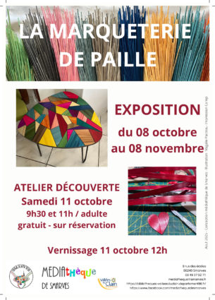 Du mercredi 08 octobre 2025 au jeudi 08 novembre 2525 Médiathèque de Smarves - 8 rue des Ecoles - 86240 SmarvesLa marqueterie de paille: Découverte de cette technique et du travail de Magalie Pacreau, Atelier 42 à travers de nombreux objets. Exposition tout public visible aux horaires d'ouverture de la médiathèque