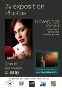 Du samedi 22 novembre 2025 au dimanche 23 novembre 2025 Salle Polyvalente - avenue du clain - 86130 DIssayLe club photo de Dissay a le plaisir de vous inviter à assister à sa 7e exposition annuelle. Composé de travaux personnels, d'un thème commun ainsi que d'un invité d'honneur (Mathieu Beaulieu)