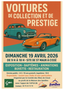 Du dimanche 19 avril 2026 au dimanche 19 avril 2026 Site de St Maur - Site de St Maur - 86170 CISSEJournée exposition et baptêmes de voitures de collection et de prestige, organisée par la Maison des Familles au CHU de Poitiers. Animations dont circuit enfants, restauration et buvette sur place. En partenariat avec le Comité des fêtes de Cissé et de l’APVA86.