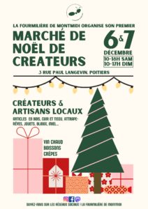 Du samedi 06 décembre 2025 au dimanche 07 décembre 2025 la fourmilière de montmidi - 3 rue Paul langevin - 86000 PoitiersMarché de Noël Créateurs locaux ( bois, vitrails, bougies, fleurs, couture ,bijoux, peinture, miel...)
