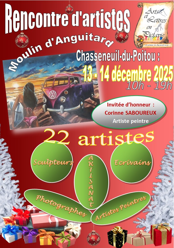 Du samedi 13 décembre 2025 au dimanche 14 décembre 2025 Moulin Anguitard - Pôle Culturel Moulin d'Anguitard - 86360 Chasseneuil du PoitouEXPOSITION d'Artistes, Écrivains et Poètes - Horaires 10 h à 19 h - Invitée d'honneur : la peintre Corinne Saboureux. Entrée gratuite - Vernissage vendredi 12 décembre à 17 h 30.