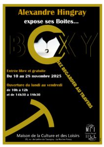 Du lundi 10 novembre 2025 au vendredi 28 novembre 2025 Maison de la Culture et des Loisirs - 25, av. de Lattre de Tassigny - 86270 LA ROCHE-POSAYExposition de boites "Boxy" (Osez regarder au travers). Ouverte du lundi au vendredi de 10h à 12h et de 14h30 à 18h30. Entrée libre et gratuite.