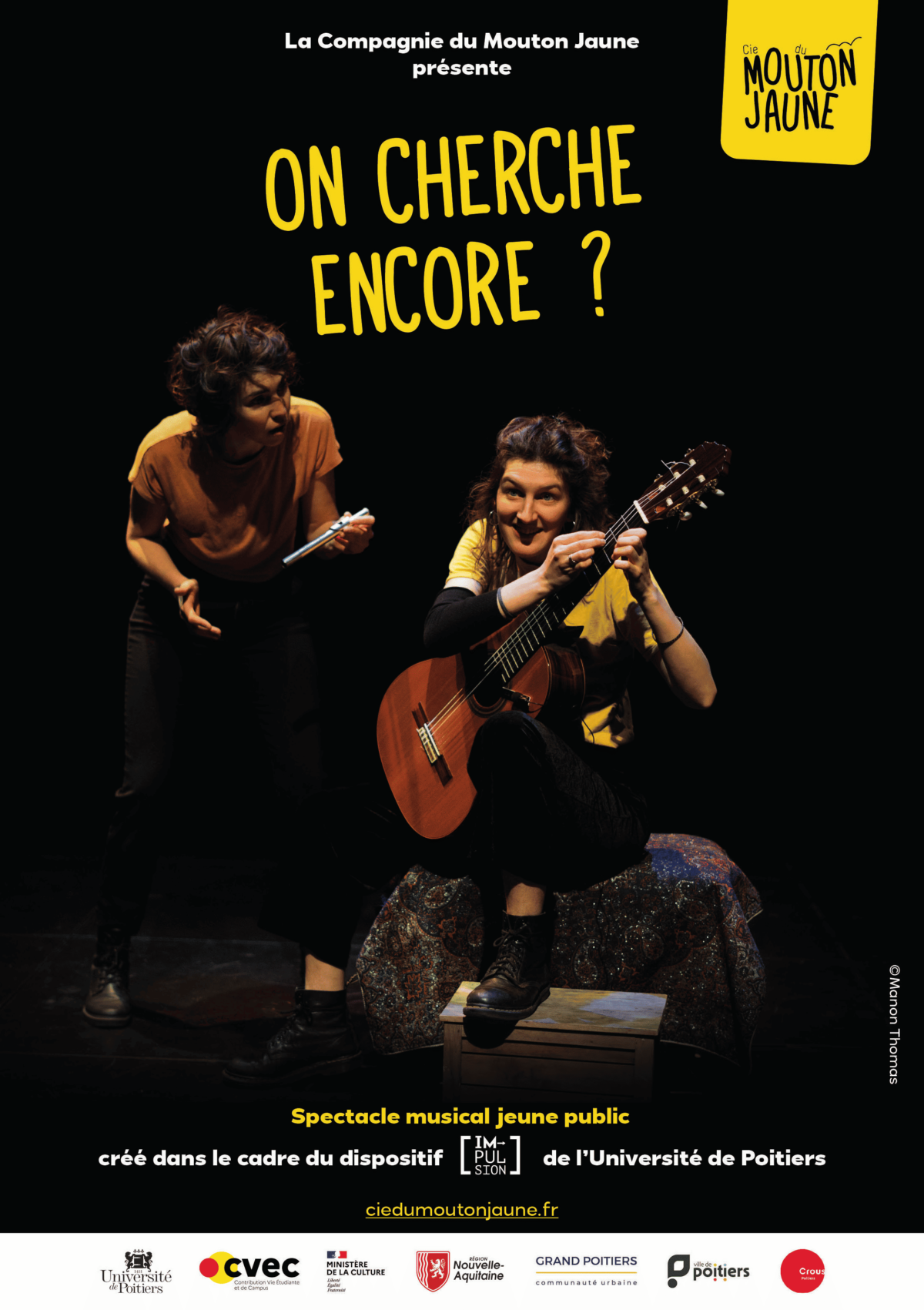 Samedi 01 novembre 2025 - 15:00 Théâtre Au Clain-TAC - 67 bis chemin de la grotte à Calvin - 86000 PoitiersDès 4 an, 45 min. Cie du Mouton Jaune.Un duo poétique et déjanté, incarné par deux artistes musiciennes. Dans un monde où le son est palpable et coloré, On cherche encore ? déroule la quête sonore et musicale de deux personnages et de leurs fidèles compagnes de jeu : Flûte Traversière et Guitare.
