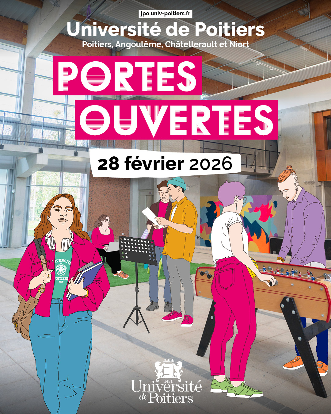 Samedi 28 février 2026 - 09:00 Campus de Poitiers, Angoulême, Niort et Châtellerault - 1 Rue Neuma Fechine Borges - 86000 PoitiersÀ l’occasion de sa Journée Portes Ouvertes le 28 février 2026, l’université de Poitiers invite les futurs étudiantes et étudiants ainsi que leur famille à venir découvrir ses campus de Poitiers, Châtellerault, Angoulême et Niort. Programme sur : jpo.univ-poitiers.fr