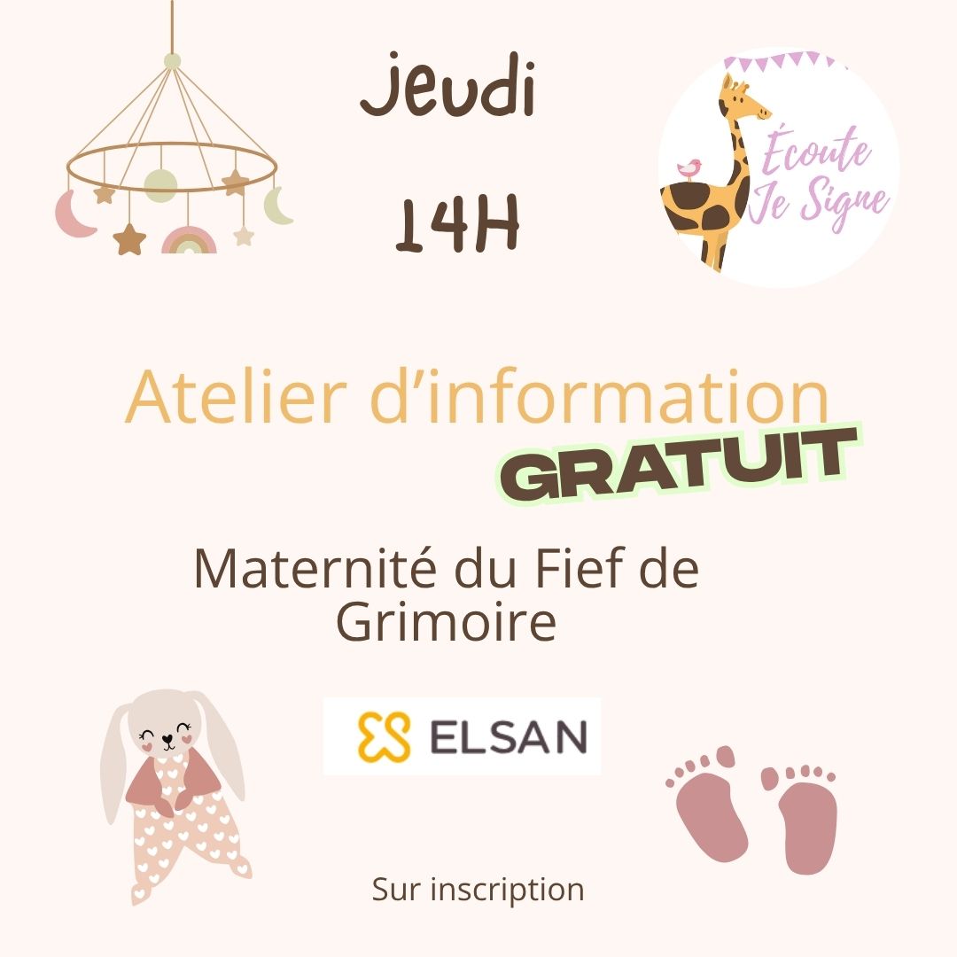 Jeudi 11 décembre 2025 - 14:00 Maternité du Fief de Grimoire - 38 rue du Fief de Grimoire - 86000 PoitiersÉchanger ,se rencontrer, s'informer sur les intérêts d’utiliser les signes –associés à la parole- pour communiquer avec votre bébé avant l’apparition du langage. Découvrir l’univers Bébé Signe et les signes associés à la parole pour accompagner votre enfant dans son développement et ses émotions.