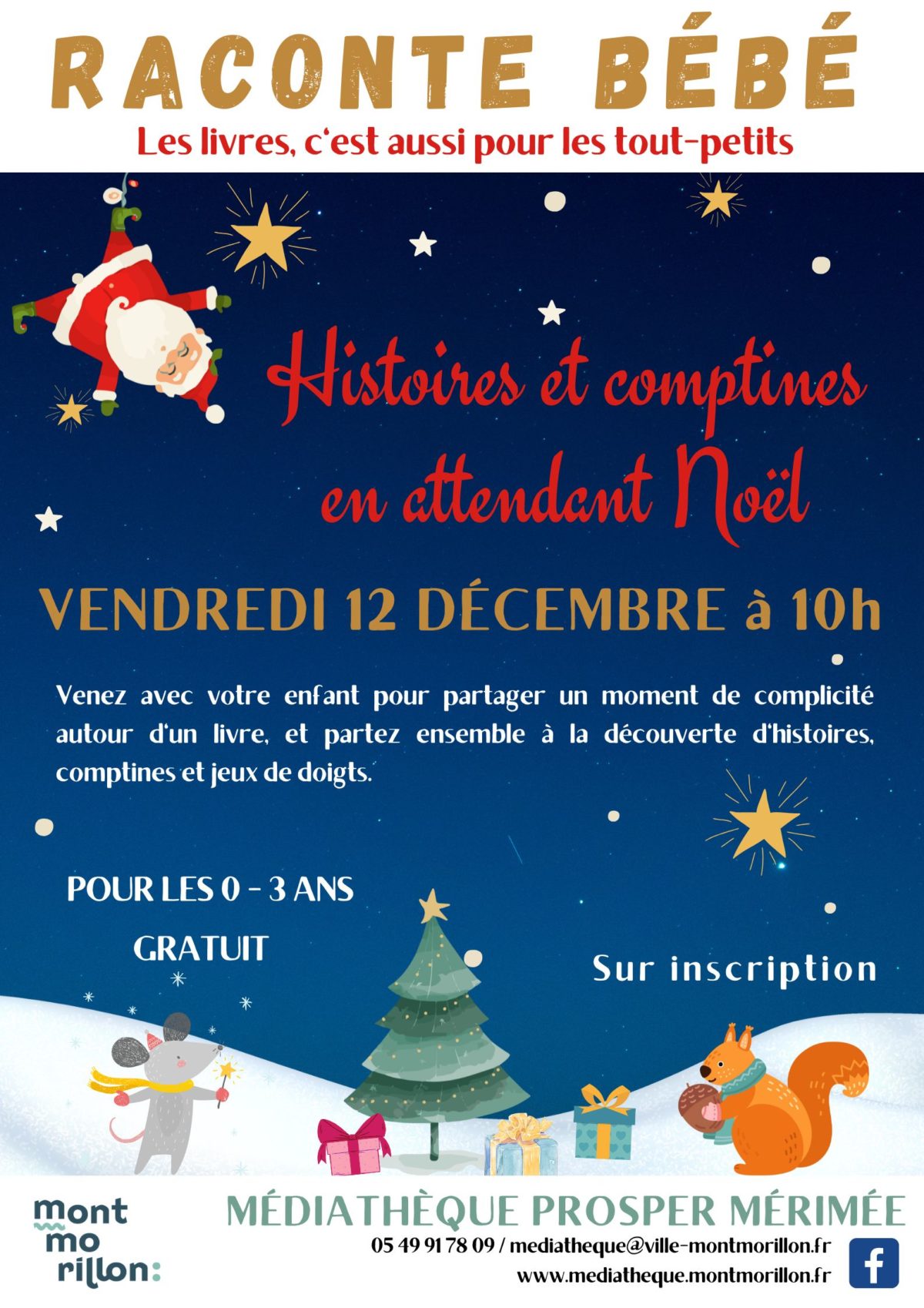 Vendredi 12 décembre 2025 - 10:00 Médiathèque Prosper Mérimée - 9 avenue Pasteur - 86500 MONTMORILLONHistoires et comptines en attendant Noël pour les 0/3 ans Venez avec votre enfant pour partager un moment de complicité autour d'un livre, et partez ensemble à la découverte d'histoires, comptines et jeux de doigts. Gratuit - Sur inscription