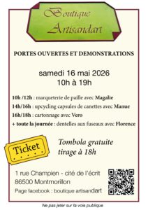 Samedi 16 mai 2026 - 10:00 Boutique Artisandart - 1 rue Champien Cité de l’Écrit - 86500 MontmorillonAfin de faire découvrir le travail des artisans createurs, l’association organise une journée porte ouverte avec des démonstrations proposées pa certains de ses createurs le 16 mai de 10h à 19h. A cette occasion une tombola gratuite sera organisée. Les tickets sont à récupérer sur place le jour même