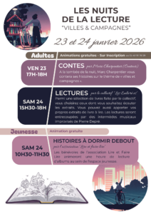 Samedi 24 janvier 2026 - 15:30 La Sabline - Médiathèque - 21, route de Montmorillon - 86320 Lussac-les-ChâteauxAdultes / Entrée libre et gratuite Venez nous raconter vos lectures, vos coups de cœur du moment et découvrir la sélection des bibliothécaires en lien avec les nuits de la lecture ayant pour thème « Villes et Campagnes ».