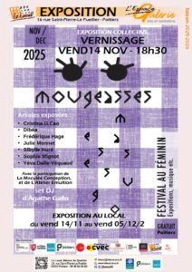 Vendredi 14 novembre 2025 - 18:30 Le Local - Espace Galerie - 16 rue Saint-Pierre-Le Puellier - 86000 PoitiersLe Festival Mougeasses a à cœur de présenter la diversité de la création féminine. Une seul ligne artistique donc : l’éclectisme. Les artistes : Cristina G.Cao, Dibéa, Frédérique Hage, Julie Monnet, Sibylle Huré, Sophie Mignot et Yéva Dalle-Véquaud. Vernissage animé par un DJ set d'Agathe Gallo.