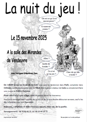 Samedi 15 novembre 2025 - 14:00 saint martin la pallu - salle des fetes des tours mirandes - 86110 saint martin la pallunuit du jeu De 14h00 jusqu'au bout de la nuit, vous pourrez randonner dans Park, comploter dans Orléans, construire les pyramides de Tikal, être le grand créateur de Gaïa ou simplement faire une course de Petits Chevaux. Pour cela il n'y a pas d'âge, petits et grands seront les bienvenus.