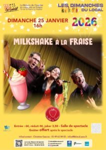 Dimanche 25 janvier 2026 - 16:00 Le Local - Salle de Spectacle - 16 rue Saint-Pierre-Le Puellier - 86000 PoitiersPar La Cie Barket de Fraises. Chansons à la fraise, humour à la fraise, instruments à la fraise... Barket de Fraises a puisé dans son répertoire pour vous concocter son Milkshake à la fraise ! L'occasion de redécouvrir des mélodies et des thèmes qui font le succès du trio depuis plus de 15 ans !