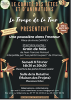 Samedi 07 février 2026 - 14:30 salle de la Rotative - Maison des Projets 48 Avenue de la Liberté - 86180 BUXEROLLESLe Comité des Fêtes de Buxerolles et la Troupe de La Tour présentent le samedi 7 février à la salle de la Rotative 2 séances théâtrales (14 h 30 et 20 h 30) avec "grain de folie" et "une poussière dans l'moteur" Prix 12 € dés 15 ans Réserv 0777222290 ou 0549479819 comitedesfetes.buxerolles@gmail.com