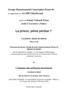 Jeudi 27 novembre 2025 - 20:45 18h Fac de droit, Ampli Hardouin, 43 place du Général de Gaulle ; 20h45 Maison du Peuple, Salle Jean-Pierre Timbaud - 43 place du Général de Gaulle ; Rue Saint-Paul - 86000 PoitiersLe GDCP et la LDH Châtellerault présentent à 18h "La prison, faute de mieux", par les étudiants de Master Criminologie et Victimologie, 2 doctorants et La Cimade pour les étrangers, et à 20h45 "L’impasse des politiques sécuritaires" par Pauline Pawlotsky, co-responsable du GT "Prisons" de la LDH