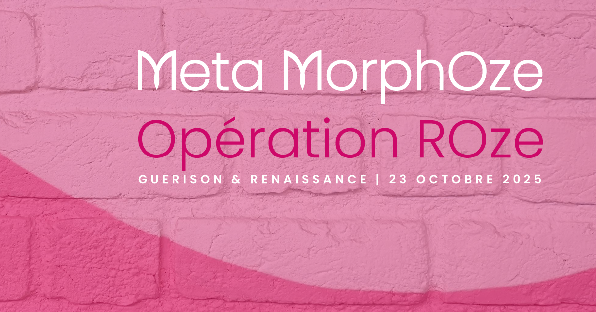 Jeudi 23 octobre 2025 - 10:00 Centre Meta MorphOze - 2 Grand Rue - 86240 LigugéOpération ROze chez Meta MorphOze : Le 23 Octobre 2025, nous vous proposons une journée tournée vers la Guérison & la Renaissance, dédiée à toutes les personnes ayant mené un combat ou menant un combat contre la maladie ou une épreuve de vie. 10€ par billets reversés à La Ligue Contre Le Cancer