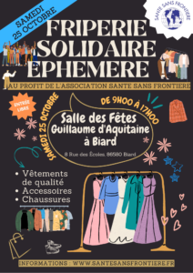 Samedi 25 octobre 2025 - 09:00 Salle Guillaume d'Aquitaine - 18 Rue des Écoles - 86580 BIARDFriperie Solidaire Éphémère organisée par l'association poitevine SANTE SANS FRONTIERE au profit de ses projets.
